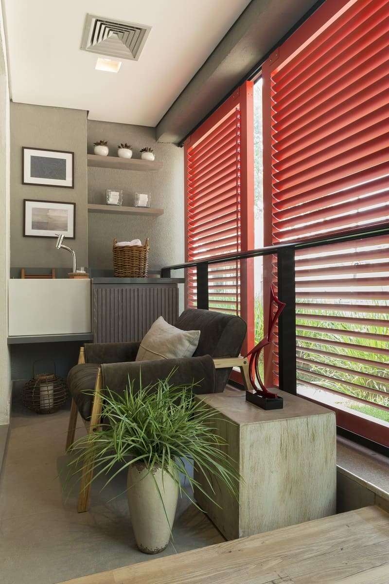 • Na varanda, de apenas 6,5 m², foi criada três maneiras de aproveitar espaço. Um dos lados serve de área de serviço, equipada com tanque e armário sob medida. O outro é um pequeno home office, com uma mesa de vidro para não haver barreiras visuais. O espaço do meio é, de fato, usado como varanda.